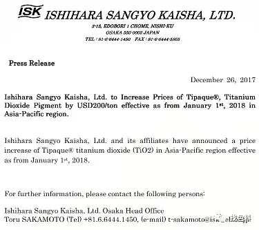 近日,石原產(chǎn)業(yè)株式會社發(fā)出公告,自2018年1月1日起,亞太地區(qū)的Tipaque?鈦白粉價格將有所上調(diào),漲幅為每噸200美元。