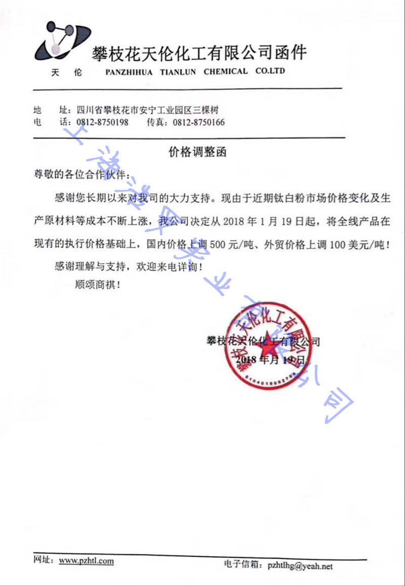 現(xiàn)由于近期鈦白粉市場(chǎng)價(jià)格變化及生產(chǎn)原材料等成本不斷上漲,決定從2018年1月19日起,將全線(xiàn)產(chǎn)品在現(xiàn)有的執(zhí)行價(jià)格基礎(chǔ)上,國(guó)內(nèi)價(jià)格上調(diào)500元/噸、外貿(mào)價(jià)格上調(diào)100美元/噸!